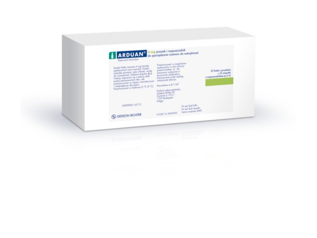 Rodzaj znieczulenia, spodziewany okres trwania zabiegu chirurgicznego, możliwe interakcje z innymi lekami podawanymi przed i podczas znieczulenia, współistniejące choroby i ogólny stan pacjenta powinny być brane pod uwagę podczas ustalania indywidualnego dawkowania. Zalecane jest stosowanie stymulatora nerwów obwodowych w celu monitorowania zwiotczenia i powrotu siły mięśniowej. Produkt leczniczy Arduan przeznaczony jest do podawania drogą dożylną, zarówno w postaci szybkich wstrzyknięć (wtedy zaleca się podawanie do kaniul żylnych o stałym przepływie płynu infuzyjnego) dla podtrzymania zwiotczenia mięśni, jak i ciągłego wlewu zapewniającego odpowiedni okres zwiotczenia. Produkt leczniczy Arduan , podobnie jak inne leki blokujące przewodnictwo nerwowo-mięśniowe, powinien być podawany tylko przez lub pod nadzorem doświadczonego klinicysty i przy dostępie do odpowiednich urządzeń umożliwiających przeprowadzenie sztucznej wentylacji płuc.