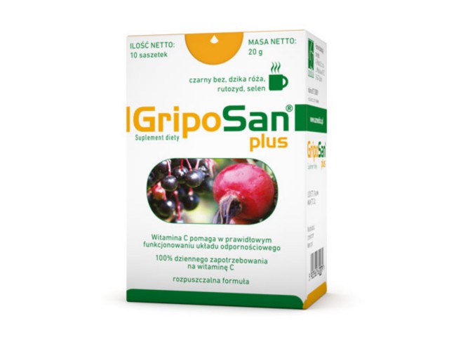 Suplement diety GripoSan® Plus zawiera w swoim składzie ekstrakt z czarnego bzu, witaminę C (z dzikiej róży) oraz selen, które korzystnie wpływają na odporność człowieka. Dodatkowo czarny bez i dzika róża dzięki zawartości antyoksydantów wspierają układ oddechowy.