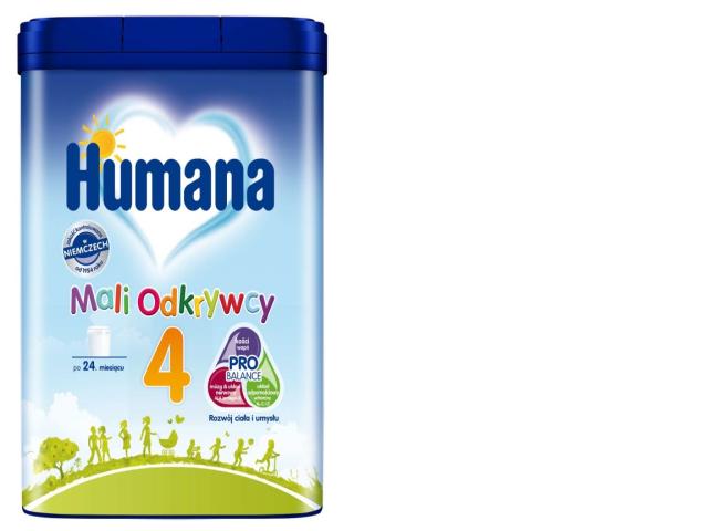 Dla rozwoju mózgu i układu nerwowego nasz napój zawiera kwas ALA (niezbędny kwas tłuszczowy omega-3). Humana 4 Mali Odkrywcy jest zbogacona o wapń oraz witaminę D, które są niezbędne do prawidłowego rozwoju kości i zębów. Witaminy A, C i D wspierają prawidłowe funkcjonowanie układu odpornościowego, a jod i żelazo wspierają prawidłowy rozwój poznawczy.