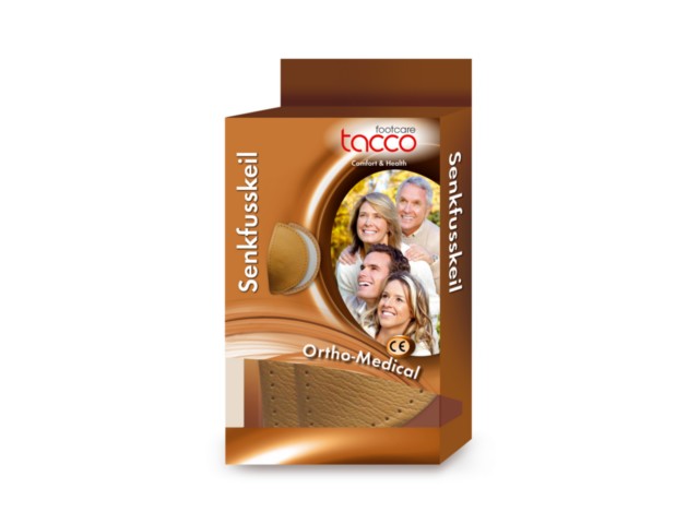 Tacco Senkfußkeil to klin pod śródstopie z funkcją RelaxFlex z wierzchnią warstwą wykonaną z ekologicznie uszlachetnionej skóry owczej. Klin podpiera łuk śródstopia, szczególnie polecany przy płaskostopiu podłużnym. Klin zapobiega przeciążeniu i zmęczeniu stopy. Tacco Senkfußkeil jest samoprzylepny.