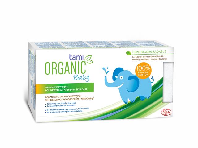 TAMI ORGANIC BABY Organiczne suche chusteczki z bawełny do pielęgnacji Noworodków i Niemowląt. 100% włókien pochodzi z rolnictwa ekologicznego. Produkt naturalny - może zawierać śladowe ilości organicznych cząstek roślinnych. 100% biodegradowalne. Bawełna organiczna pochodzi z certyfikowanych ekologicznych upraw na których rośnie zgodnie z naturalnym cyklem rozwoju, bez użycia nawozów chemicznych. Dlatego chusteczki wykonane z czystej , organicznej bawełny są naturalne i bezpieczne. Polecane do delikatnej i podatnej na alergie skóry noworodków i niemowląt. Idealne do mycia i osuszania buzi, oczu, szyi, fałdek skóry. Nie rwą się, są odpowiednio grube i wytrzymałe a jednocześnie delikatne, miękkie i chłonne. Użyte jednorazowo zmniejszają możliwość przeniesienia zarazków. Testowane Dermatologicznie. Wyprodukowano w Polsce